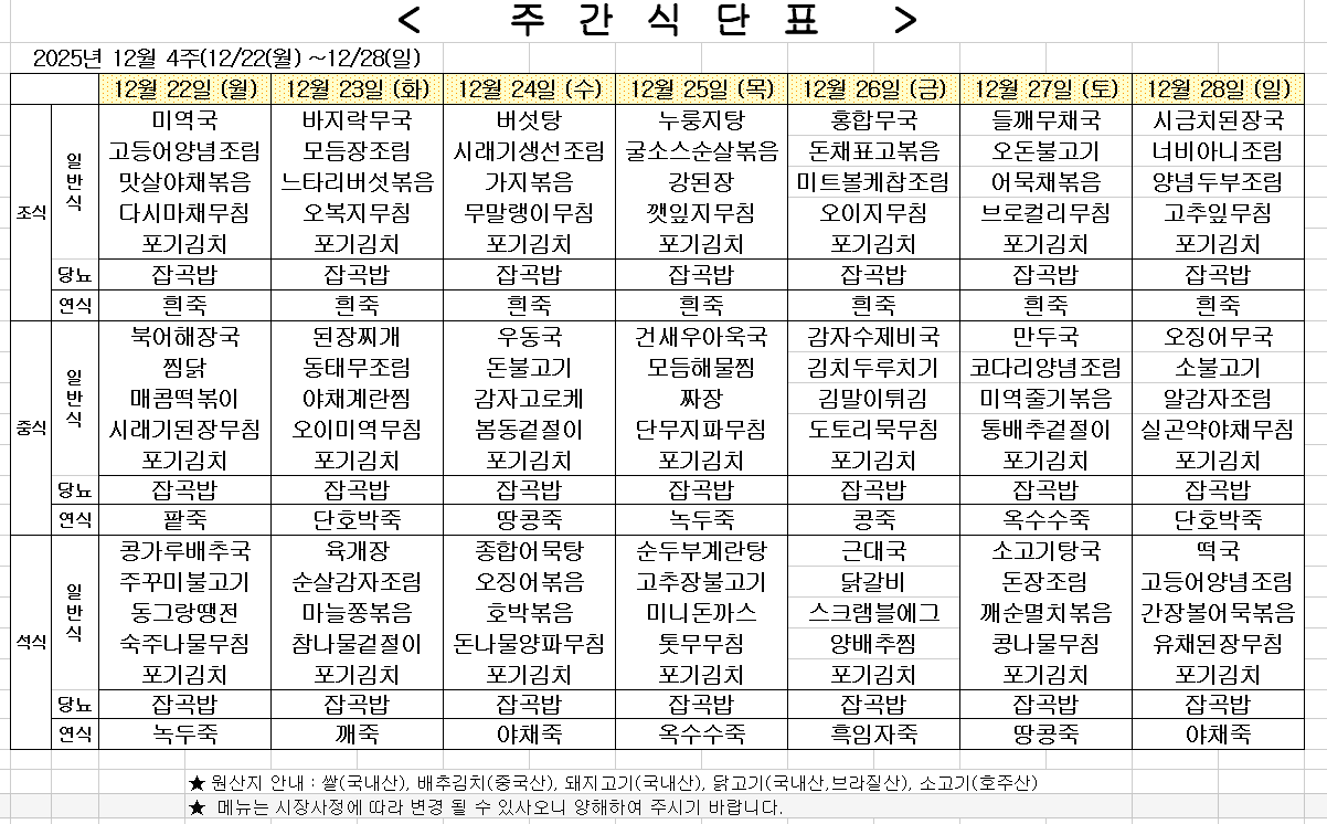 2025년 12월 4주차 식단표