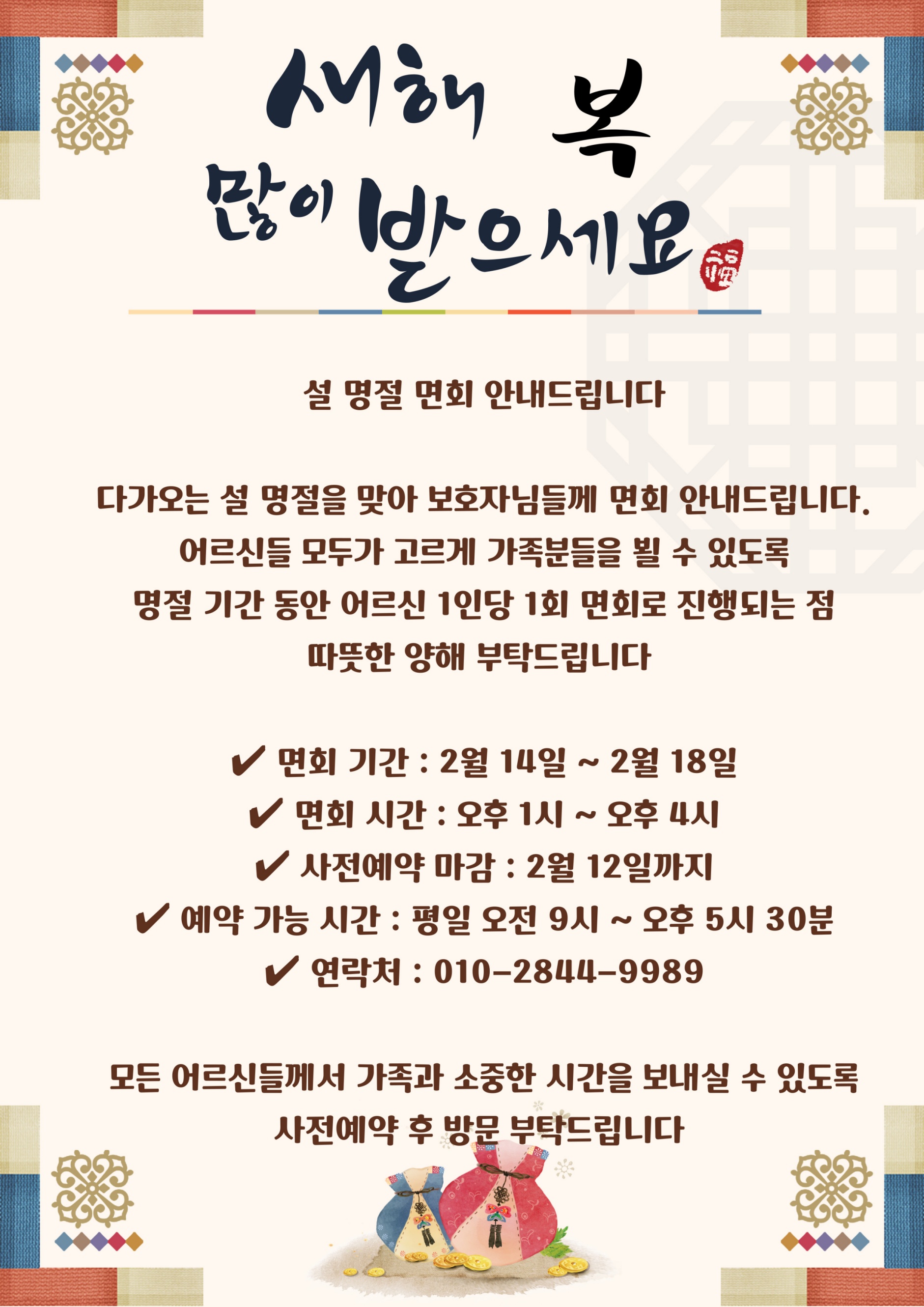 ○ 요즘 계속적인 독감 및 호흡기 질환으로 설 명절에 대한 면회수칙 안내문을 준수해주세요.
